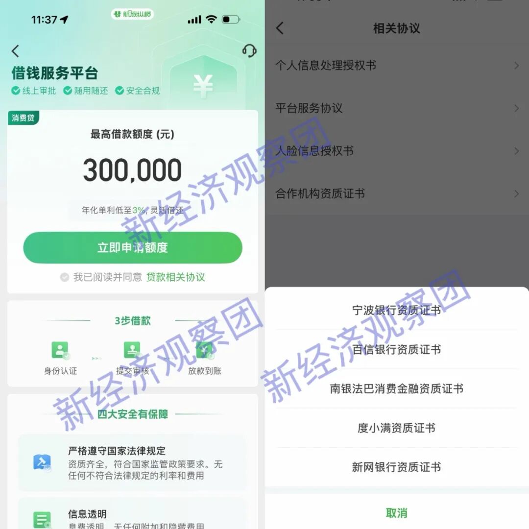 目前,航旅纵横的借钱服务与宁波银行、百信银行、南银法巴消金、度小满、新网银行合作,最高额度30万,年化利率最低3%。
