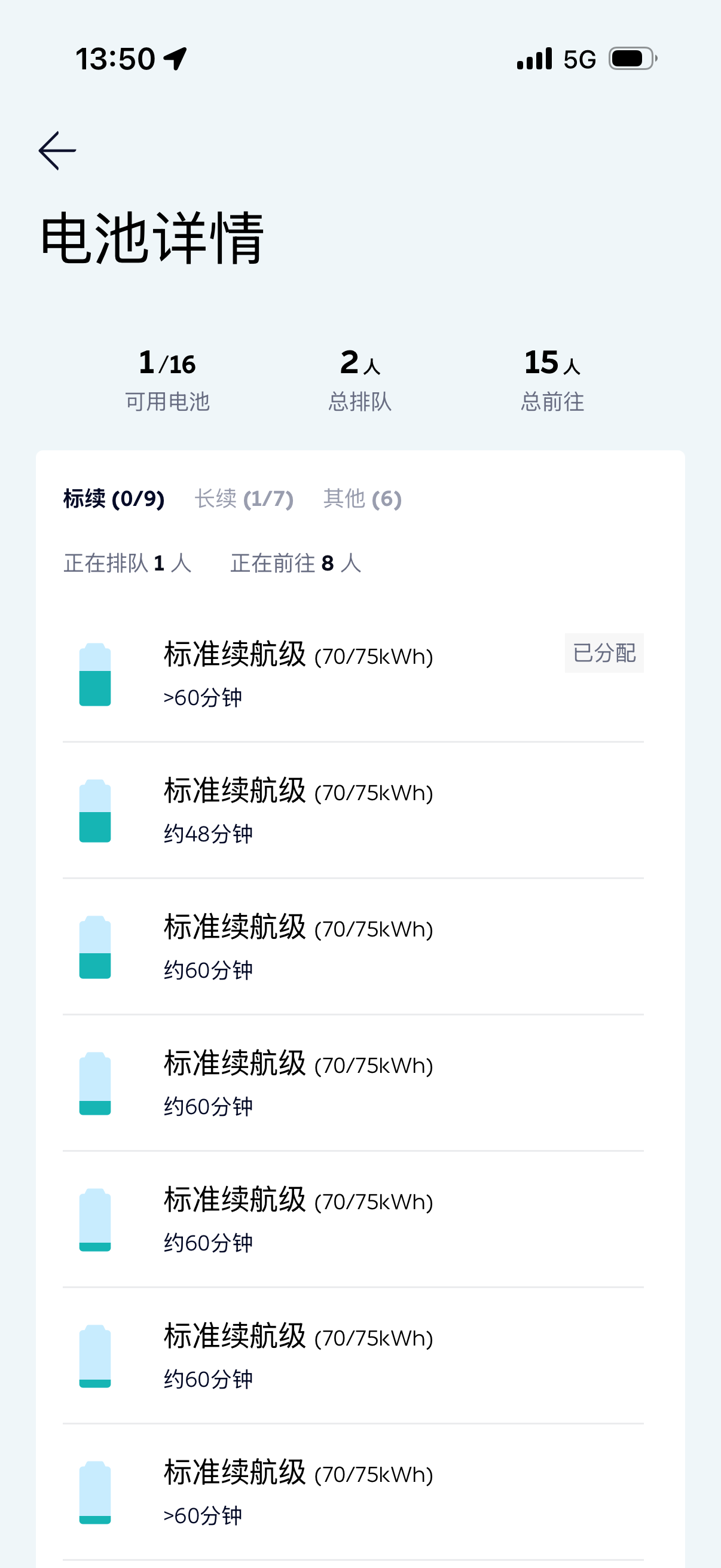 在2月15日(春节假日首日)下午1点50分,同样是在G4石家庄东服务区内,16块电池仅有1块可用,其余15块都处于站内充电状态,大多电池需要充电60分钟才能使用。彼时据蔚来APP显示,站内有2人在排队等待电池。