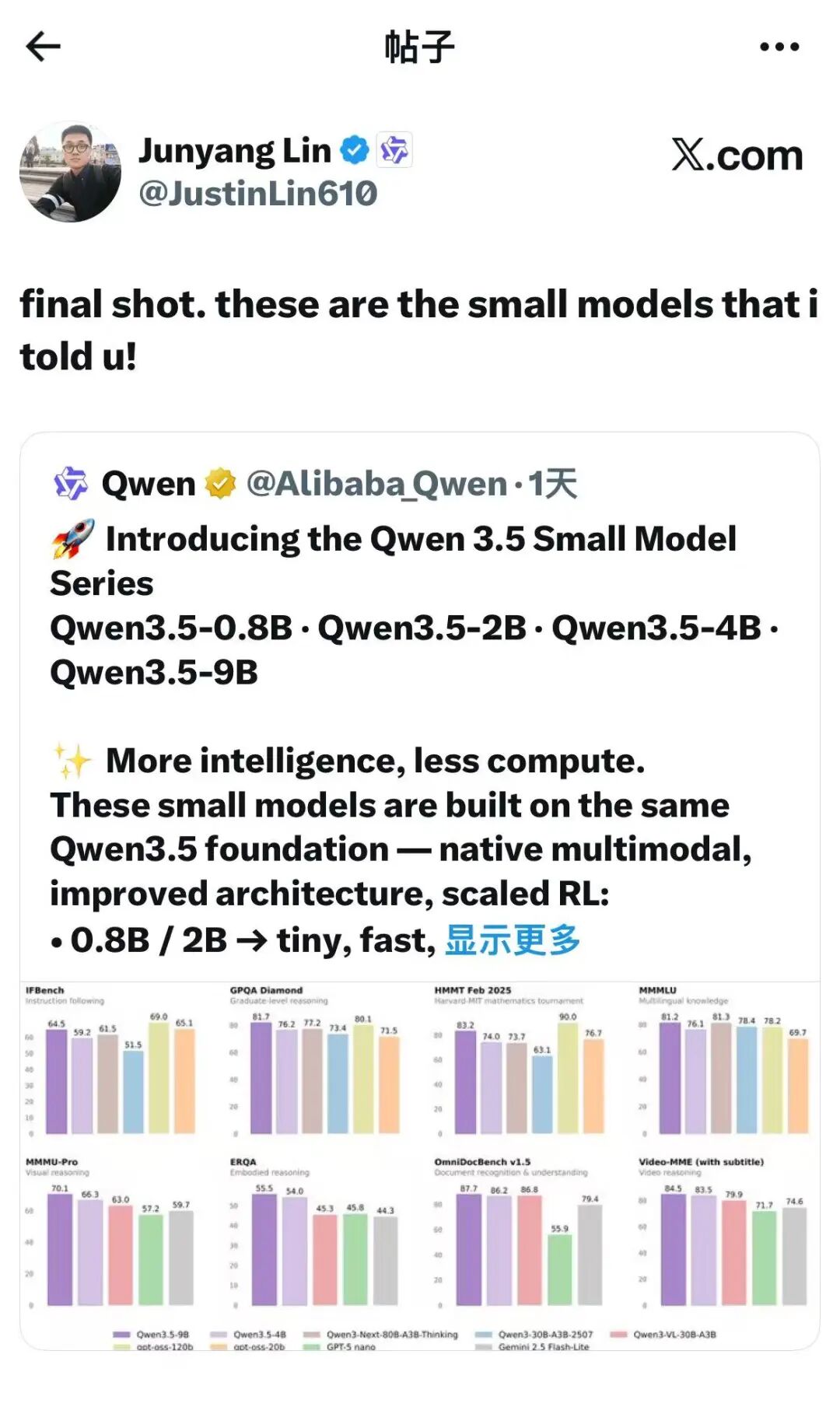 就在前一天,林俊旸还在社交媒体与团队一同庆祝 Qwen3.5 小尺寸模型发布,并收获了包括马斯克在内的互动点赞。
