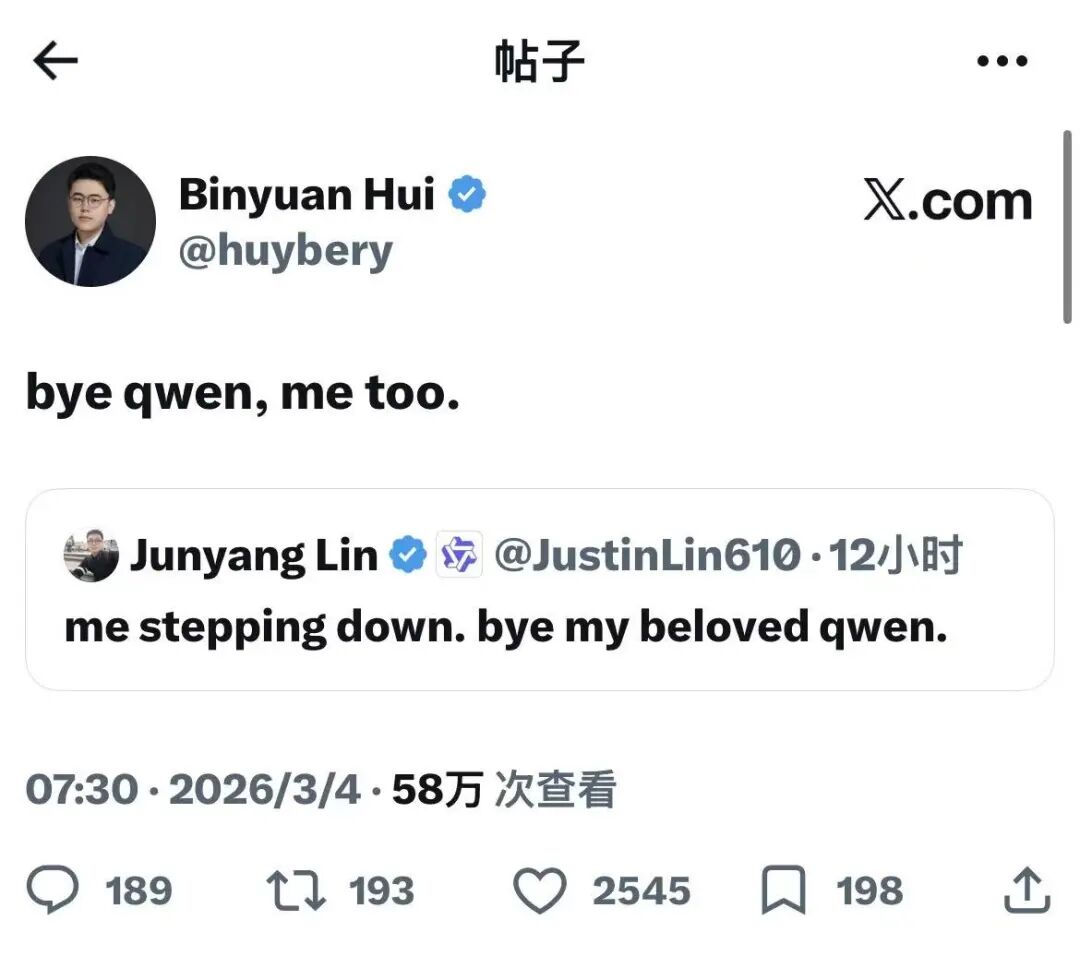 3 月 4 日凌晨,阿里 Qwen 团队技术负责人林俊旸在社交媒体 X 发推文:“再见了我爱的 Qwen。”
