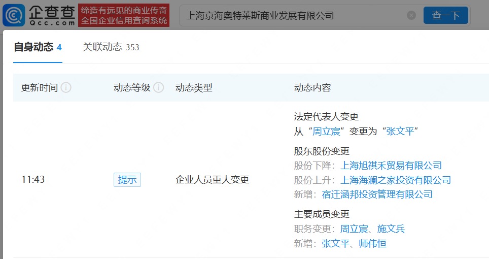 企查查APP显示,近日,上海京海奥特莱斯商业发展有限公司发生工商变更,新增京东旗下宿迁涵邦投资管理有限公司为股东,法定代表人从海澜集团董事长周立宸变更为张文平。