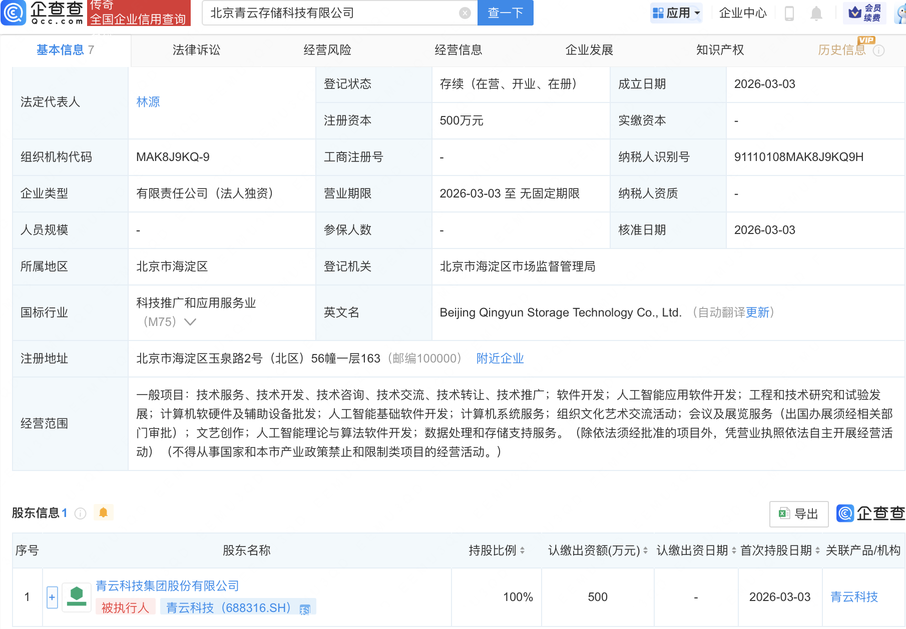 企查查APP显示,近日,北京青云存储科技有限公司成立,经营范围包含:人工智能应用软件开发;人工智能基础软件开发;人工智能理论与算法软件开发;数据处理和存储支持服务等。企查查股权穿透显示,该公司由青云科技(688316)全资持股。