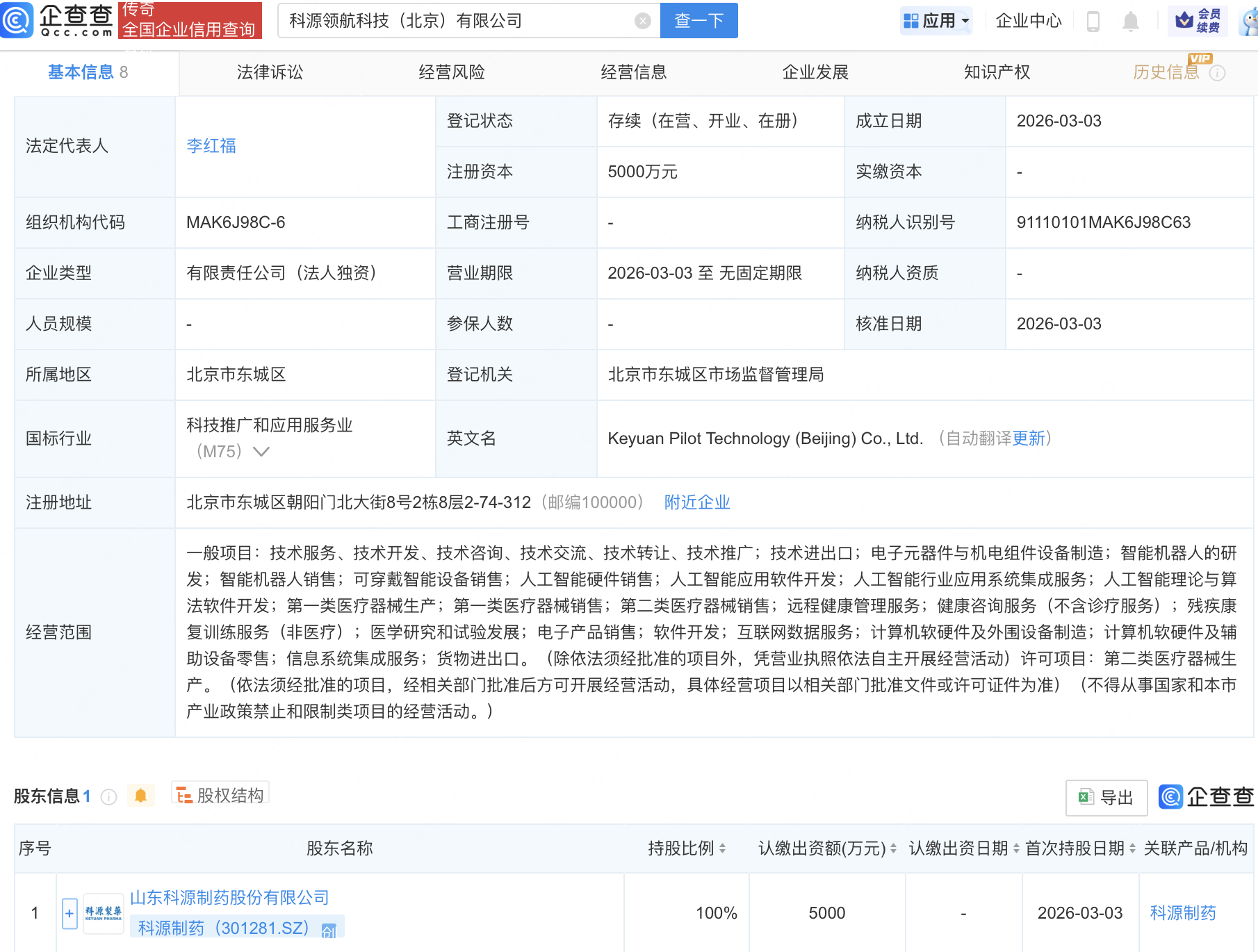 企查查APP显示,近日,科源领航科技(北京)有限公司成立,注册资本5000万元,经营范围包含:智能机器人的研发;智能机器人销售;可穿戴智能设备销售;人工智能硬件销售;人工智能应用软件开发等。企查查股权穿透显示,该公司由科源制药(301281)全资持股。