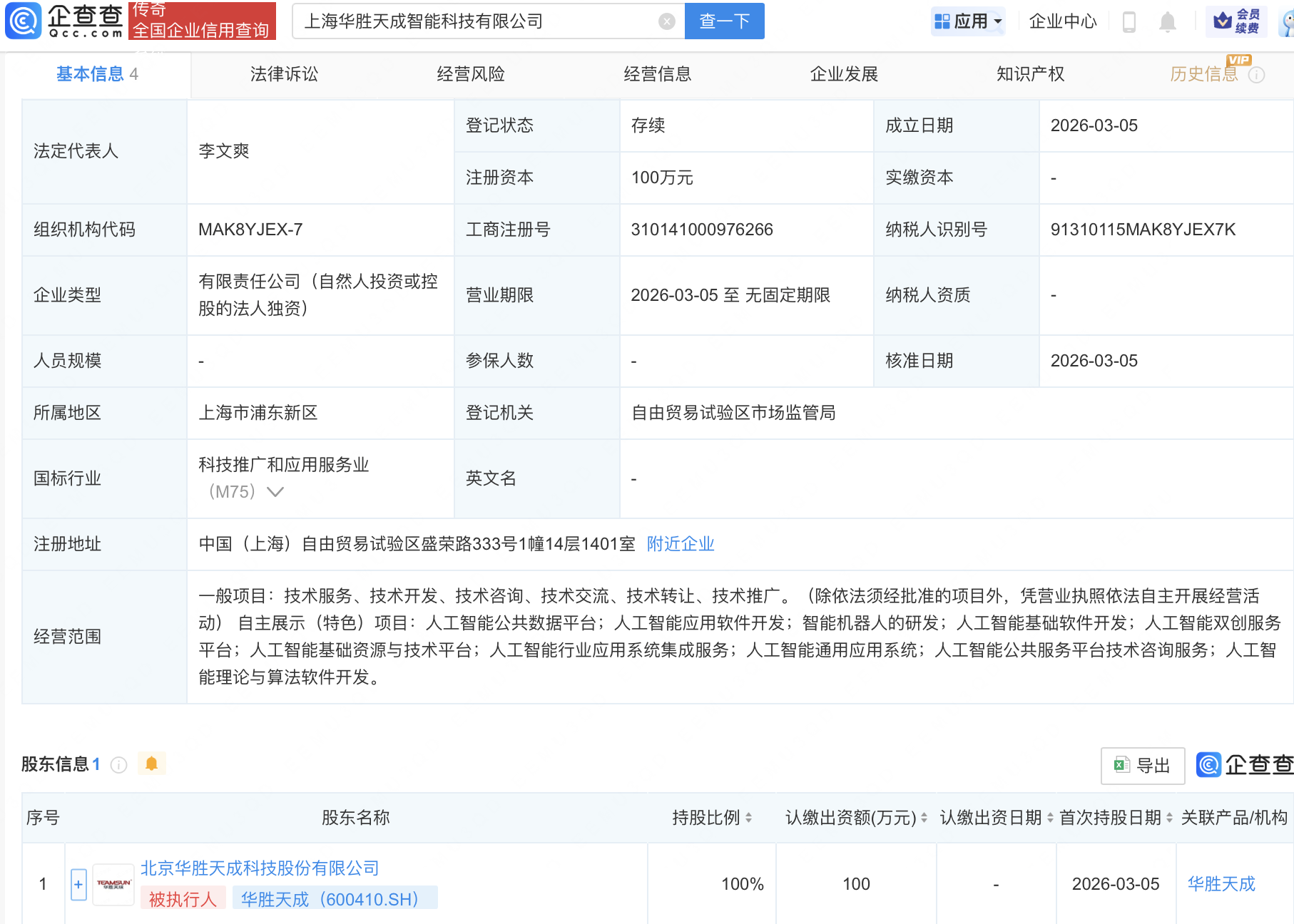 企查查APP显示,近日,上海华胜天成智能科技有限公司成立,经营范围包含:人工智能公共数据平台;人工智能应用软件开发;智能机器人的研发;人工智能基础软件开发;人工智能双创服务平台等。企查查股权穿透显示,该公司由华胜天成(600410)全资持股。