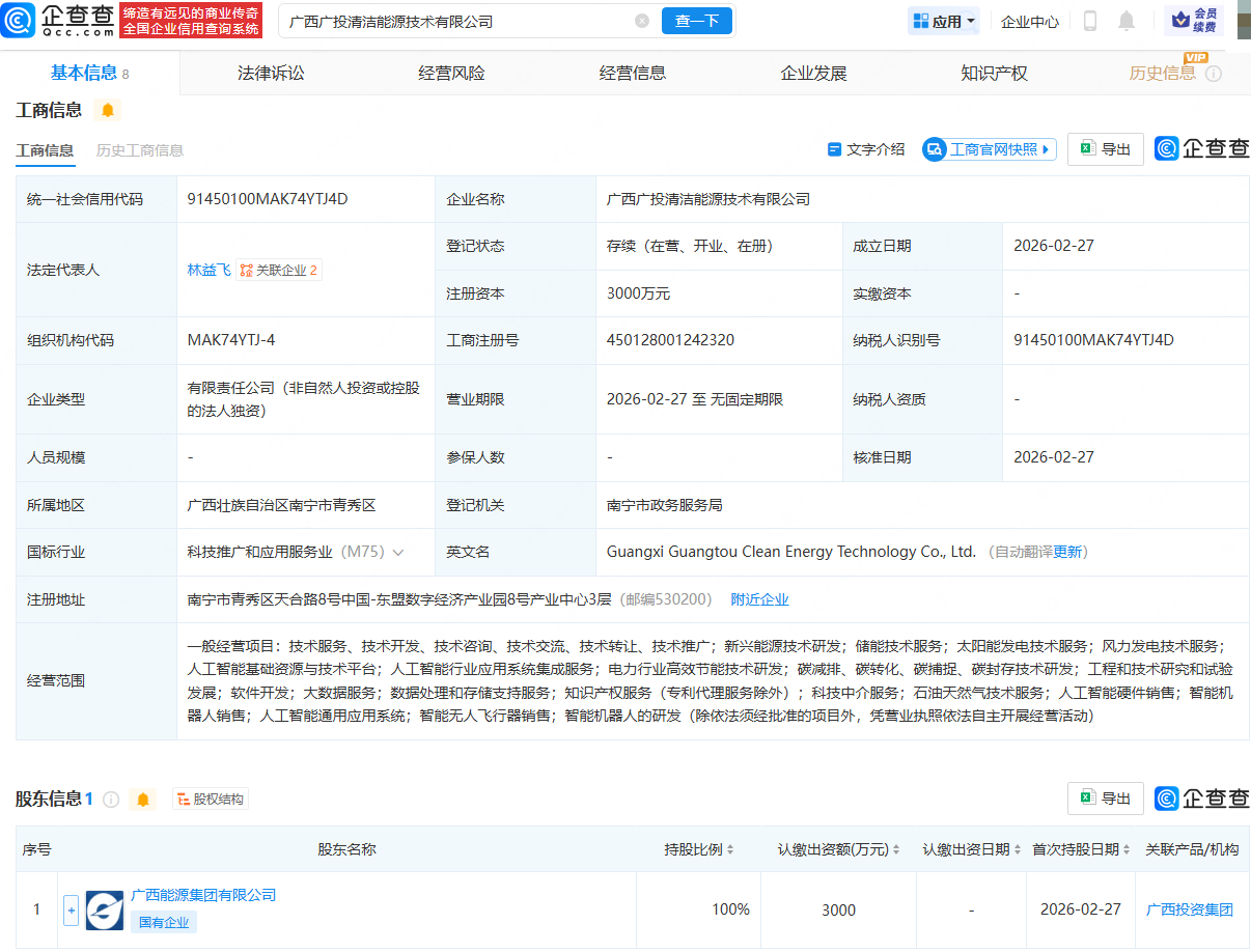 企查查APP显示,近日,广西广投清洁能源技术有限公司成立,法定代表人为林益飞,注册资本为3000万元,经营范围包含:新兴能源技术研发;储能技术服务;太阳能发电技术服务;风力发电技术服务;人工智能基础资源与技术平台等。企查查股权穿透显示,该公司由广西能源集团有限公司全资持股。