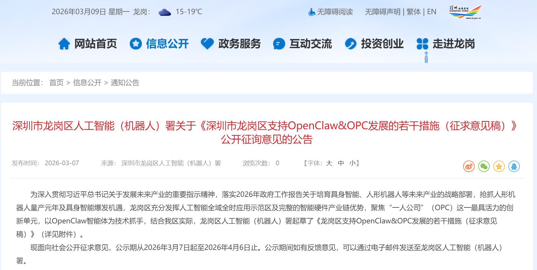 消息面上,日前,深圳市龙岗区人工智能(机器人)署发布关于《深圳市龙岗区支持OpenClaw&OPC发展的若干措施(征求意见稿)》公开征询意见的公告,并面向社会公开征求意见。涵盖OpenClaw免费部署与开发支持、OpenClaw专属数据服务支持、OpenClaw类智能体工具采购支持、OpenClaw类智能体工具应用示范支持、AIGC模型调用支持、算力与场景应用支持、人才与创业空间支持、基金融资支持、产品出海支持、赛事奖励支持等十大方向,旨在深入实施“人工智能+”行动,大力培育产业发展新业态新模式,构建产业集聚、创新活跃的人工智能OPC创业生态。
