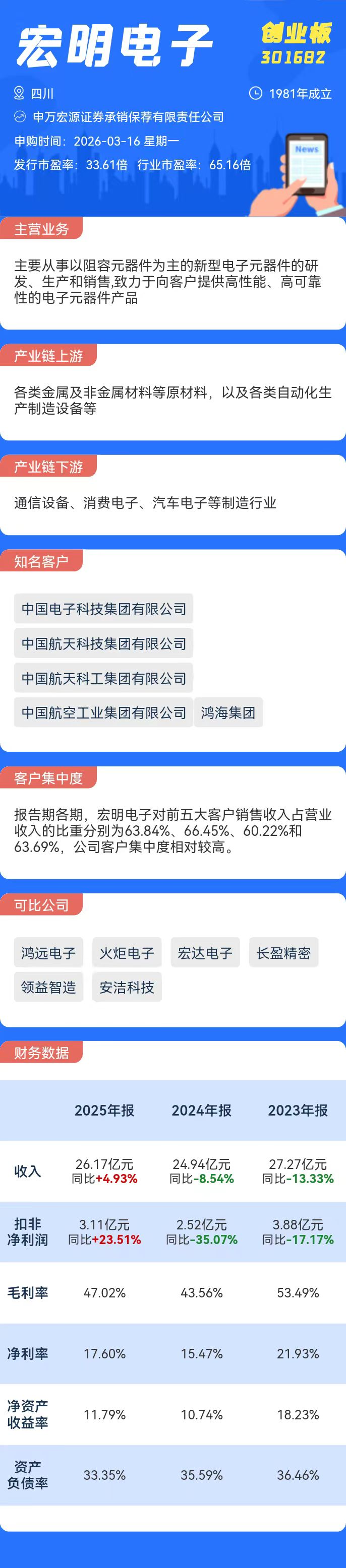 募资情况方面,据招股书,宏明电子原计划拟发行3038.73万股,募资约19.51亿元,分别用于高储能脉冲电容器产业化建设项目(5.09亿元)、新型电子元器件及集成电路生产项目一期/二期(3.94亿元)、精密零组件能力提升项目(0.99亿元)、高可靠阻容元器件关键技术研发项目(1.5亿元)、电子材料与元器件关键技术研发项目(1.5亿元)、3C精密零组件、新能源电池及汽车电子结构件研发项目(1亿元)、数字化能力提升项目(0.98亿元)、补充流动资金(4.5亿元)。以此次69.66元/股的发行价计算,公司此次实际募资约21.17亿元,与原计划相比超募了约8%。