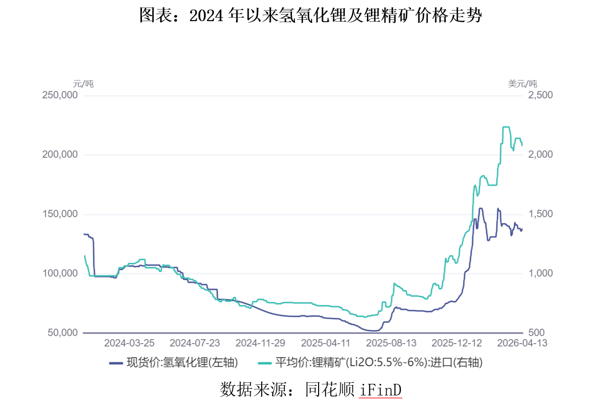 同花顺iFinD数据显示,氢氧化锂价格自2025年7月初触及5.19万元/吨的周期低点后,逐步开启回暖态势,12月初回升至7.63万元/吨,随后加速上涨,2026年1月末飙升至15.5万元/吨,一季度整体维持高位震荡,均价较上年同期显著提升。碳酸锂的价格走势基本与氢氧化锂类似。