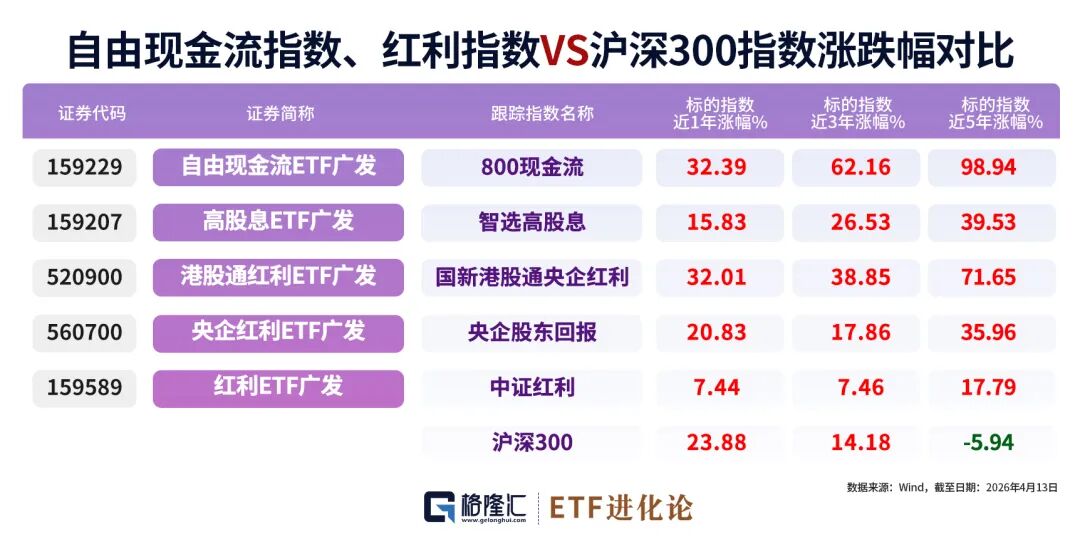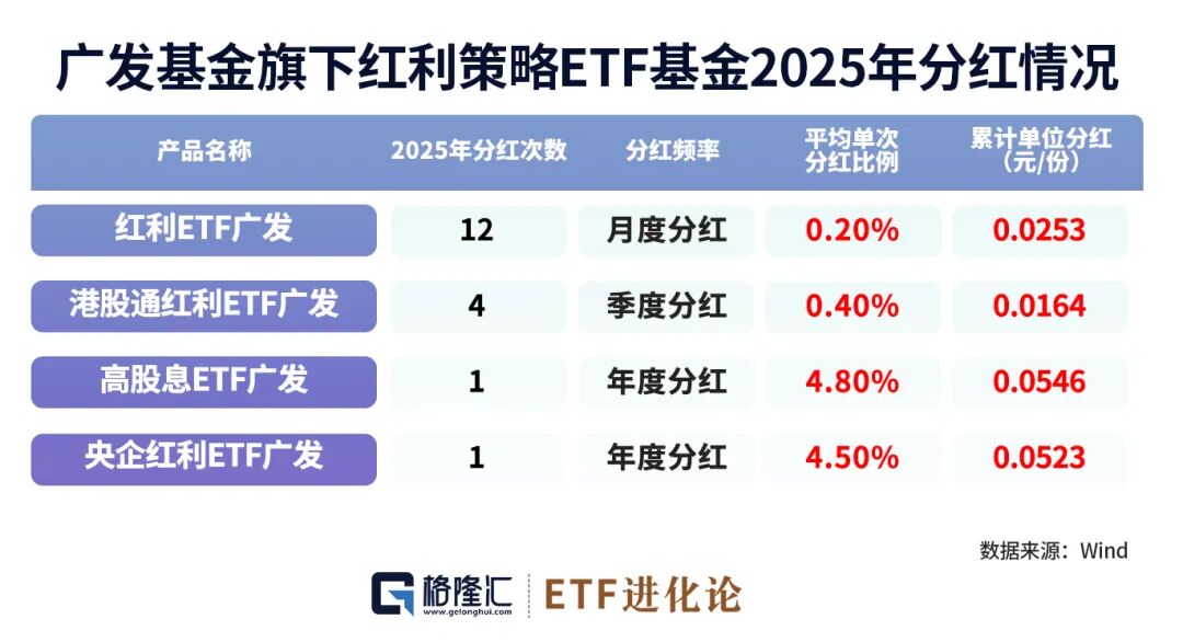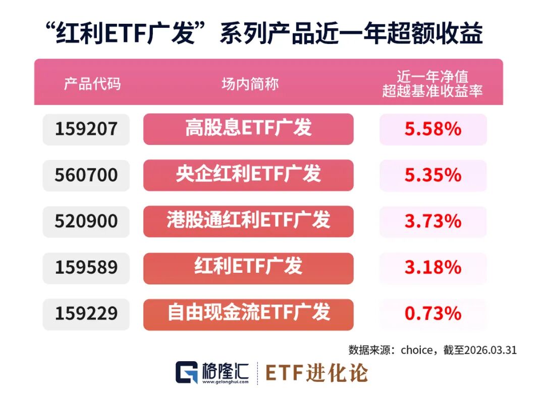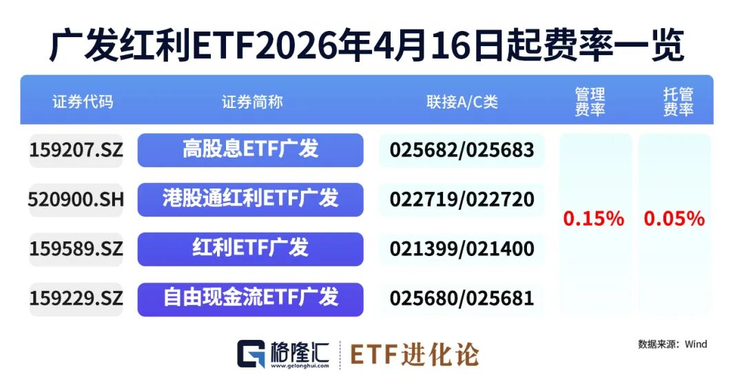 03 广发红利工具箱:“降费”更见精细 在投资中,费率的微小变化也会直接影响最终收益。 为降低投资者持有成本,4月16日起,广发基金旗下4只红利主题指数产品完成降费,管理费率将由0.5%下调至0.15%,托管费率降至0.05%,进入全市场同类产品的最低费率区间。 降费背后,体现的是红利产品工具化、精细化的行业趋势。 一方面,这有助于降低投资者的长期持有成本;另一方面,对于“长钱”属性突出的红利策略而言,低费率能够减少收益损耗,从而提升长期表现的稳定性。 在控制成本之外,基金分红方案的设计也能影响投资者的持有体验。 以广发基金旗下红利产品为例,其2025年分红情况如下: 从分红的频率和比例看,广发的红利类ETF分红节奏多样,月度、季度、年度分红均有产品配置;分红比例分布合理,一年一度分红的高股息ETF广发、央企红利ETF广发分红比例较高;分红频次更高的红利ETF广发、港股通红利ETF广发,平均分红更为平滑。 从产品的长期表现看,以“红利ETF广发”系列产品为例,截至2026年一季度末,其近一年整体取得一定超额收益。其中港股通红利ETF广发、央企红利ETF广发在同类标的ETF中超额收益最高。 04 五大维度:构建多维“红利航海图” 广发基金旗下5只红利ETF产品,本质上从不同维度刻画了红利资产的多种形态,可以理解为对分红来源、选股方法和市场结构的拆解。 第一类,是对传统红利策略的优化。高股息ETF广发(159207)跟踪的中证智选高股息指数,不再单纯依赖历史股息,而是基于“分红预案股息率”进行选股,并将调仓时间提前至每年5月。 其核心在于提升对分红的前瞻性,减少“历史高股息但未来下降”的情况,同时通过波动率加权,使组合在收益与波动之间更为均衡。 得益于指数编制优势,其标的指数最新股息率达6.51%,在A股红利类指数中居首。 第二类,是市场维度的延伸。港股通红利ETF广发(520900)聚焦港股央企,底层资产主要分布在能源、通信、公用事业等行业龙头,更集中在实体产业,金融地产权重更低。从数据上看,相较A股,港股整体估值更低,港股上市央企的股息率相对更高。 第三类,是央企维度的红利表达。在央企估值重构背景下,央企注重改善盈利质量,有逐步扩大分红力度的趋势,与红利策略适配度高。除了布局港股央企,广发在A股市场亦有对标ETF。 央企红利ETF广发(560700)在编制过程中将分红与回购统一纳入“股东回报”指标,并据此进行选股与加权。这种方式强化了对股东回报的衡量,其成份股主要集中在能源、基建、公用事业的高股息央企。 第四类,是标准化红利工具。红利ETF广发(159589)跟踪中证红利指数,选样范围广、行业分布相对分散,覆盖银行、能源、交通等传统高分红板块,具有代表性强、结构稳健的特点。 最后一类,是从现金流角度切入。自由现金流ETF广发(159229)以企业自由现金流为核心筛选指标,自由现金流强调的是“真实可支配现金”。相比单纯关注分红结果,这一策略更侧重分红能力的来源。 整体来看,广发的“红利工具箱”,围绕“稳定现金流与分红能力”,兵分三路构建出具有差异化优势的工具矩阵:一是选股逻辑(历史分红、预案分红、现金流、股东回报),二是资产范围(A股与港股、央企与非央企),三是行业结构(传统高分红行业占比差异)。 广发基金在指数业务领域深耕17年,旗下ETF管理规模已超过2600亿元。这种积累,使其在产品设计上不仅追求覆盖广度,也积极拓展结构深度。 从产品体系的优化到费率的下调,其核心都在于在波动市场中,尽可能保留那份企业经营所创造的现金流价值,为投资者构建出多维度的“红利航海图”。 本文作者从业编号:A20260413000375 风险提示:观点仅供参考,不构成投资建议,市场有风险,投资需谨慎。指数基金存在跟踪误差。 上述内容仅反映当前市场情况,今后可能发生改变,不代表任何投资意见或建议。指数过往业绩不代表其未来表现,亦不构成基金投资收益的保证或任何投资建议。指数运作时间较短,不能反映市场发展的所有阶段。指数基金存在跟踪误差,基金过往业绩不代表未来表现。购买任何基金产品前请阅读《基金合同》《招募说明书》等法律文件,请根据自身风险承受能力、投资目标等选择适合自己的产品。市场有风险,投资需谨慎。