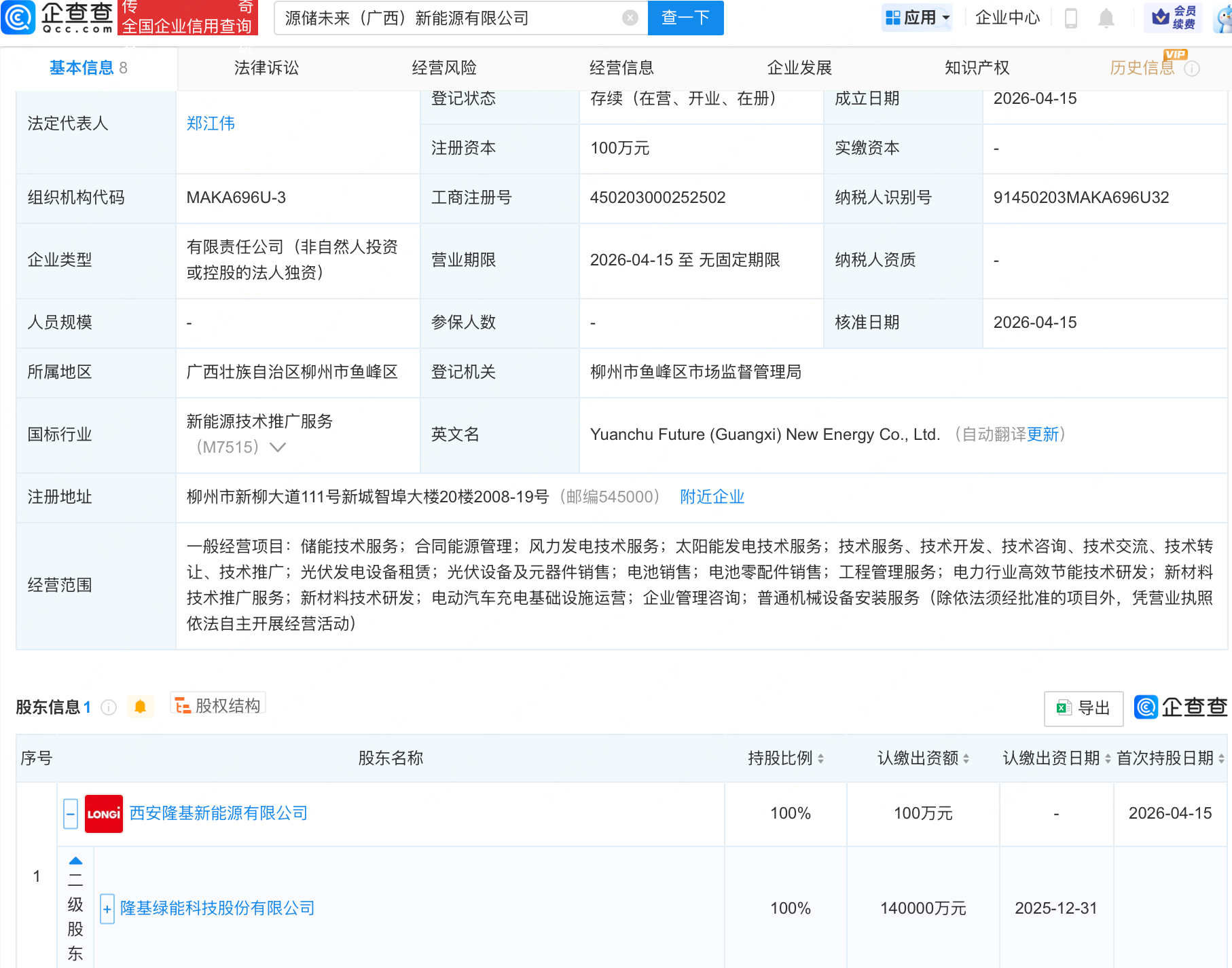 企查查APP显示,近日,源储未来(广西)新能源有限公司成立,经营范围包含:储能技术服务;合同能源管理;风力发电技术服务;太阳能发电技术服务等。企查查股权穿透显示,该公司由隆基绿能(601012)间接全资持股。