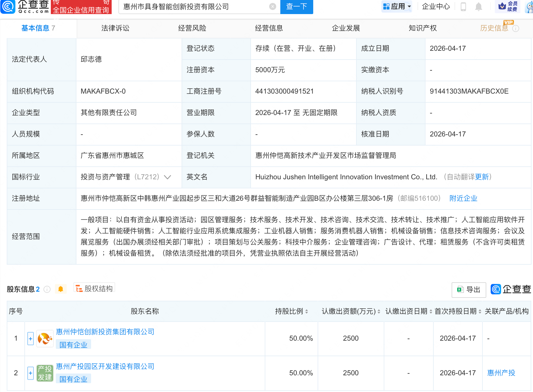 企查查APP显示,近日,惠州市具身智能创新投资有限公司成立,经营范围包含:人工智能应用软件开发;人工智能硬件销售;人工智能行业应用系统集成服务;工业机器人销售;服务消费机器人销售等。企查查股权穿透显示,该公司由惠州仲恺创新投资集团有限公司等共同持股。