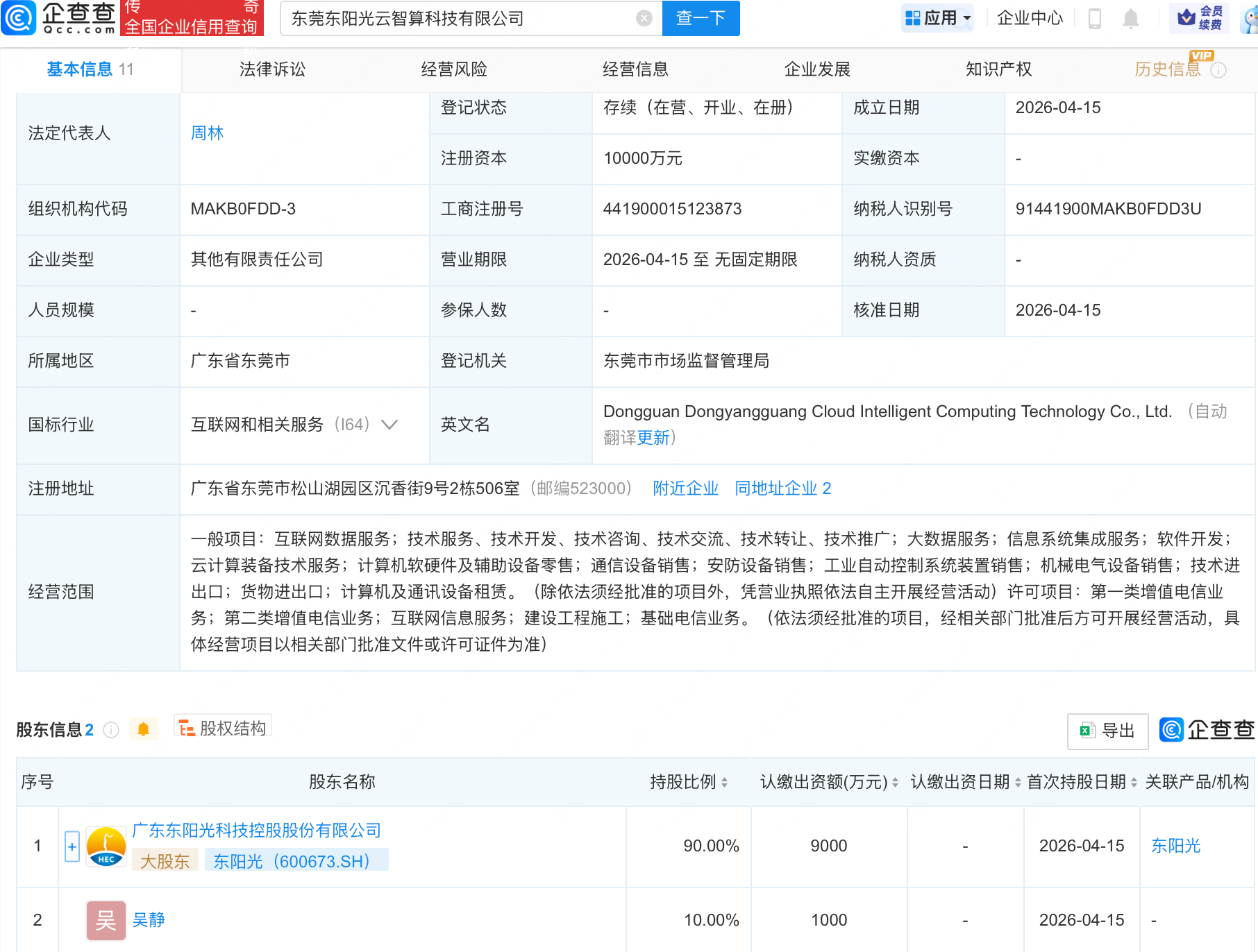 企查查APP显示,近日,东莞东阳光云智算科技有限公司成立,注册资本1亿元,经营范围包含:大数据服务;信息系统集成服务;软件开发;云计算装备技术服务等。企查查股权穿透显示,该公司由东阳光(600673)等共同持股。
