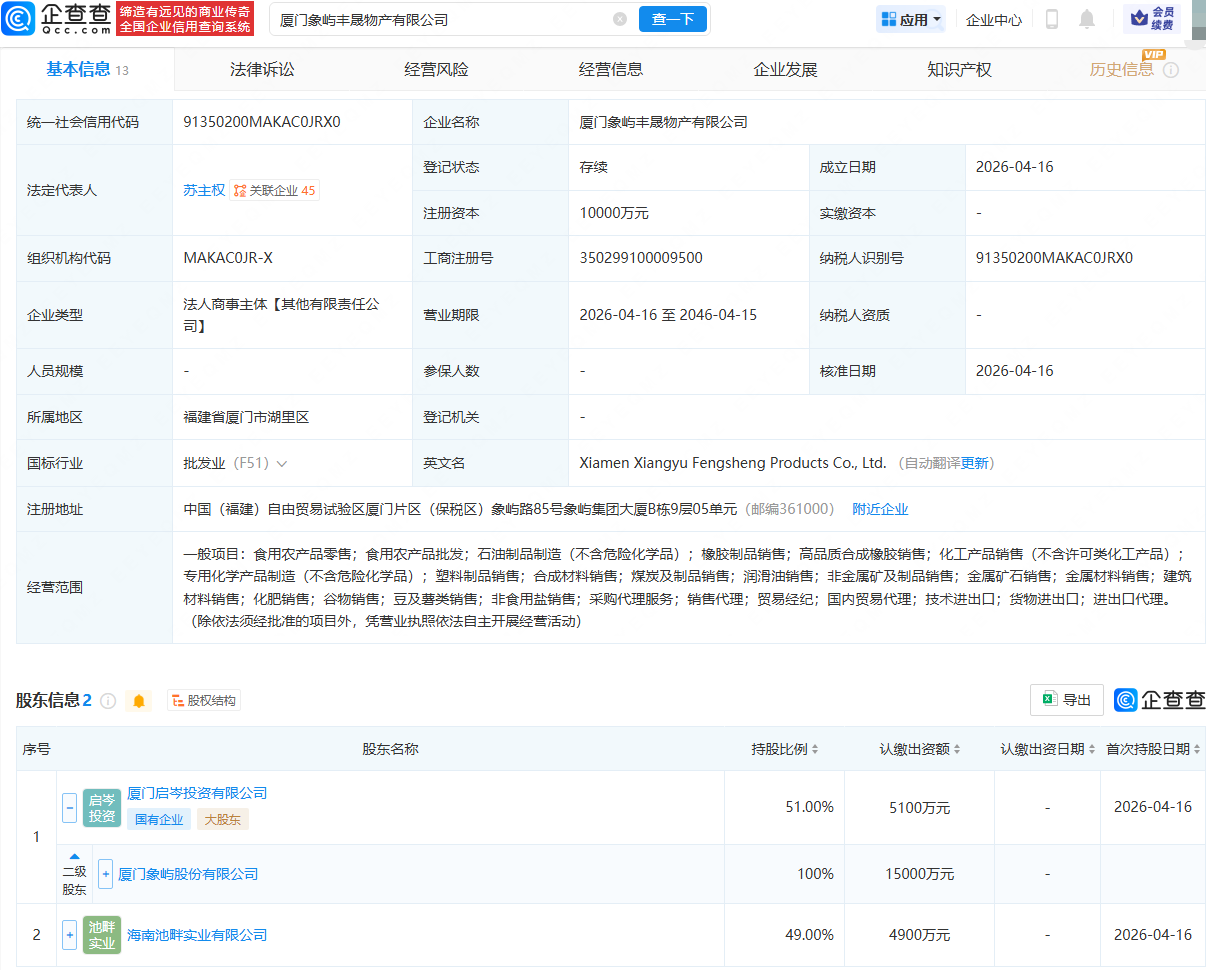 企查查APP显示,近日,厦门象屿丰晟物产有限公司成立,法定代表人为苏主权,注册资本为1亿元,经营范围包含:食用农产品零售;食用农产品批发;金属矿石销售;金属材料销售;建筑材料销售;化肥销售等。企查查股权穿透显示,该公司由厦门象屿(600057)全资子公司厦门启岑投资有限公司、海南池畔实业有限公司共同持股。