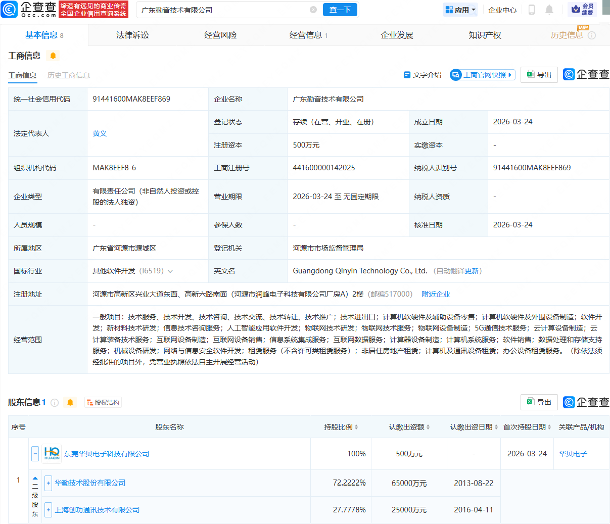 企查查APP显示,近日,广东勤音技术有限公司成立,法定代表人为黄义,经营范围包含:人工智能应用软件开发;物联网技术研发;5G通信技术服务;云计算设备制造;新材料技术研发等。企查查股权穿透显示,该公司由华勤技术(603296)旗下东莞华贝电子科技有限公司全资持股。