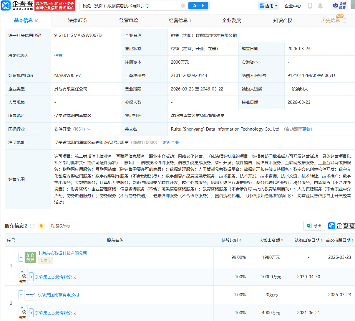 企查查APP显示,近日,锐兔(沈阳)数据信息技术有限公司成立,法定代表人为仵甘,注册资本为2000万元,经营范围包含:互联网数据服务;工业互联网数据服务;物联网应用服务;人工智能公共数据平台等。企查查股权穿透显示,该公司由东软集团(600718)旗下上海东软数据科技有限公司、东软集团南京有限公司共同持股。
