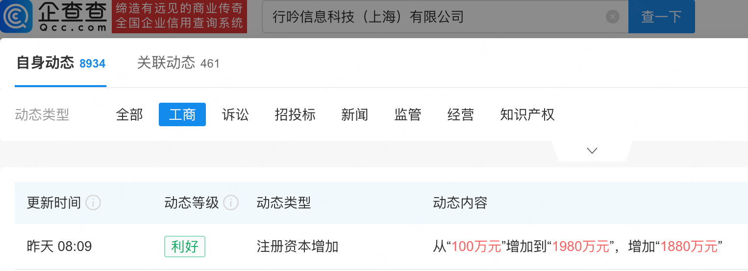 企查查APP显示,近日,小红书关联公司行吟信息科技(上海)有限公司发生工商变更,注册资本由100万元增至1980万元。企查查信息显示,该公司成立于2013年,法定代表人为任爽,经营范围含互联网销售、供应链管理服务、服装服饰零售、日用百货销售等,由毛文超、瞿芳共同持股。