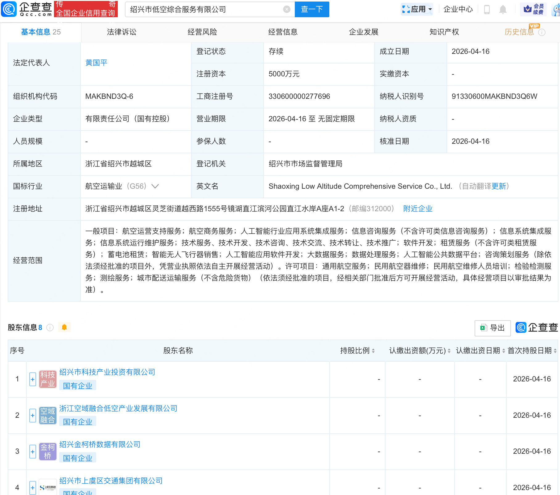 企查查APP显示,近日,绍兴市低空综合服务有限公司成立,注册资本5000万元,经营范围包含:航空运营支持服务;航空商务服务;人工智能行业应用系统集成服务等。企查查股权穿透显示,该公司由绍兴市科技产业投资有限公司等共同持股。
