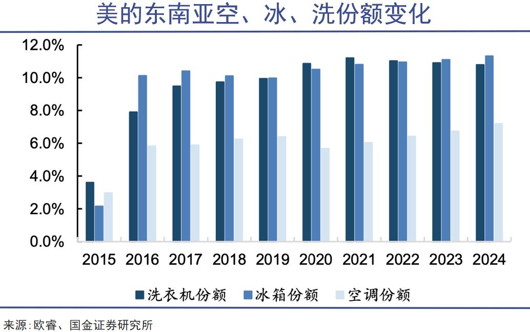 从2016年开始,美的在东南亚市场份额逐年抬升,2024年冰洗份额已超过10%,销售额在马来西亚已升至第一,冰箱在泰国和越南分别为第一和第二名。