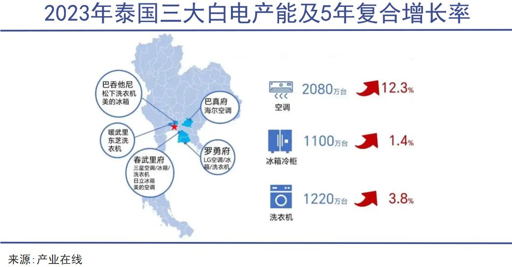 尤其是在春武里府、罗勇府等地区拥有众多家电产业链,三星、LG、伊莱克斯、日立等国际家电巨头均已进驻泰国,并出口到全球市场。美国2024年进口的空调就有近9%来自泰国。