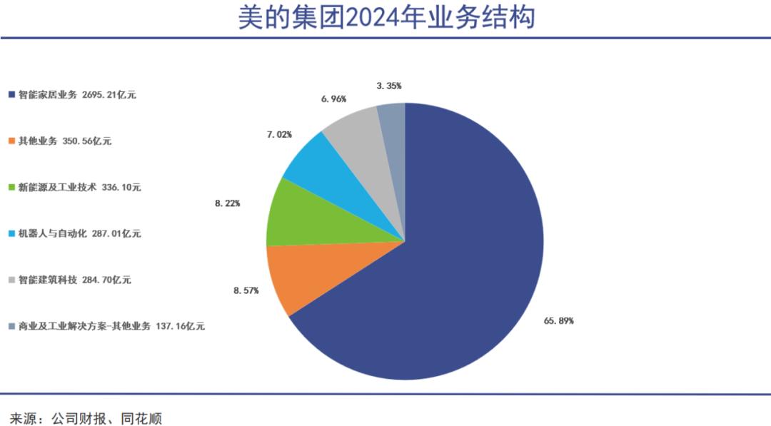 2024年财报数据显示,美的智能家居业务收入占比为65.9%,商业及工业解决方案的总收入占比已攀升至25.6%,非家电业务接近三分之一。而且非家电业务的增速显著超过传统家电。
