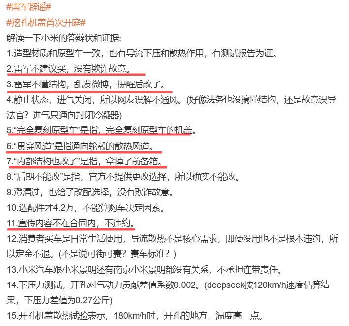 有业内人士称,小米法务团队的辩护逻辑不外乎两点,一是强调雷军多次在宣传中表示产品价格贵,不建议购买,已经尽到了提醒消费者的义务;二是量产机盖只是照着原型车的样子做的,且宣传内容不在购车合同内,不构成违约。