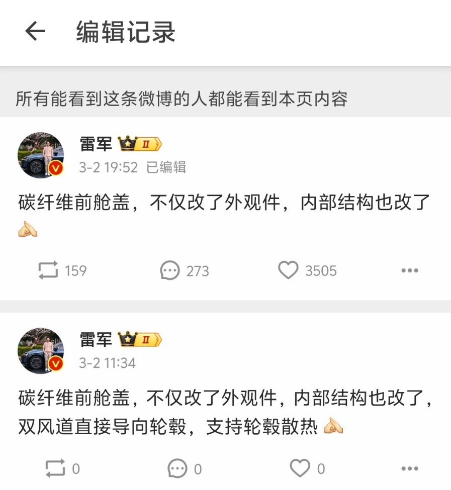 事实上,雷军曾发文,称碳纤维双风道前舱盖不仅改了外观件,内部结构也改了,双风道直接导向轮毂,支持轮毂散热,虽然雷军六小时后续修改了部分表述,但仍承诺了内部结构的改动,由此吸引了大批用户为其支付额外费用。