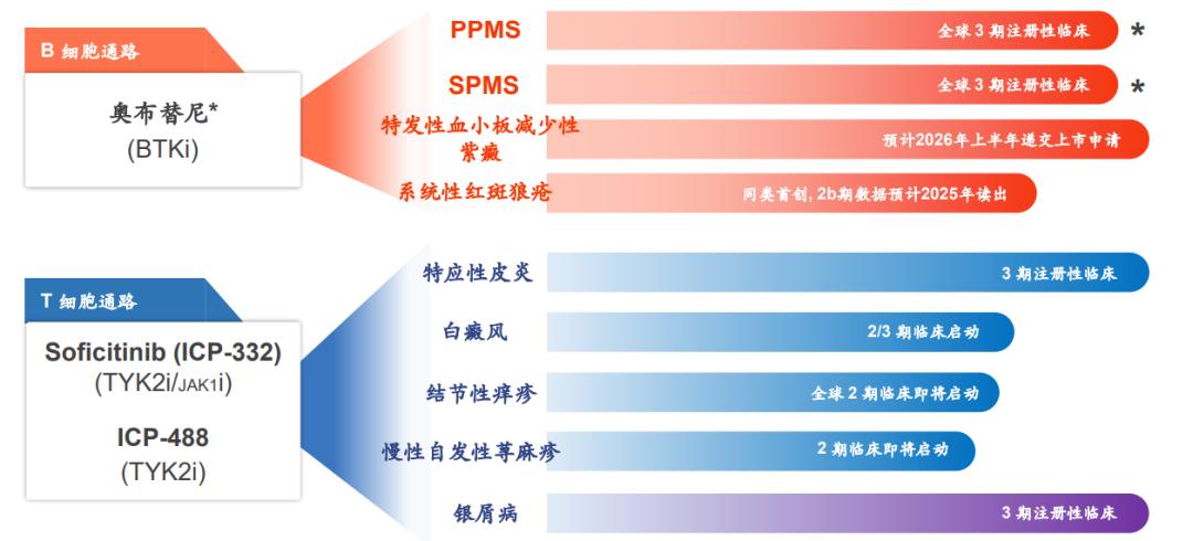 作为国内首个进军自免领域的BTK抑制剂,奥布替尼的多维突破成为核心看点:在SLE领域,其IIb期临床研究达成关键里程碑,成为全球首个在该适应症II期试验中展示显著疗效的BTK抑制剂;在多发性硬化症(MS)领域,奥布替尼针对原发进展型(PPMS)和继发进展型(SPMS)的全球多中心III期研究正稳步推进;在ITP领域,其III期注册临床已完成研究,预计2026年上半年即可提交NDA上市申请。