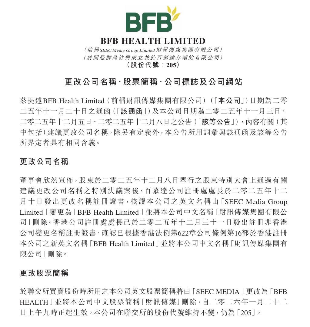 近日,港股上市公司财讯传媒集团有限公司更名为“BFB Health Limited”,英文股票简称“SEEC MEDIA”更改为“BFB HEALTH”,并删除中文股票简称“财讯传媒”,港股代码“00205”保持不变。