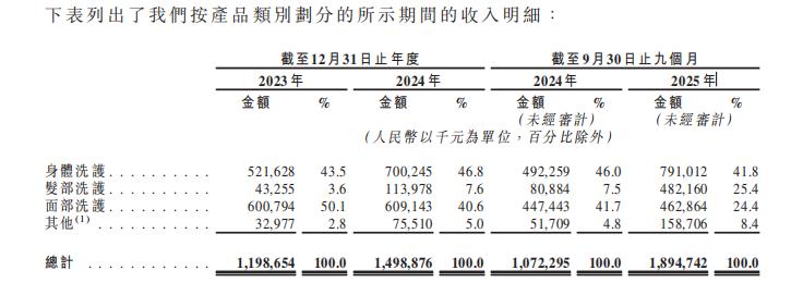 相比之下,面部洗护平均售价由2023年的20.7元降至截至2025年9月30日止9个月的16.5元,占比下降与价格下探并行,既可能反映竞争加剧,也可能意味着其在该板块的“品牌心智”并未稳定固化。