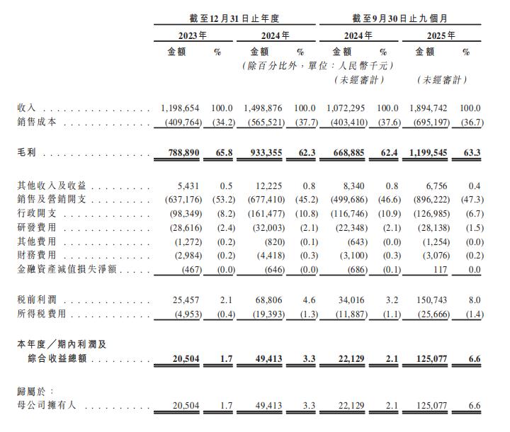 据招股书披露,半亩花田的营业收入从2023年的11.99亿元升至2024年的14.99亿元,2024年同比增长25.0%,截至2025年9月30日止9个月(即“2025年前9个月”)进一步升至18.95亿元,同比增幅达到76.7%。