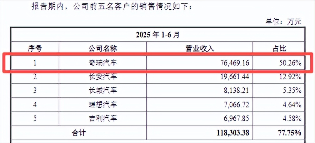 2024年,埃泰克来自奇瑞的营收占比高达53.89%,即便在2025年上半年微降至50.26%,仍远超制造业公认的30%安全阈值。