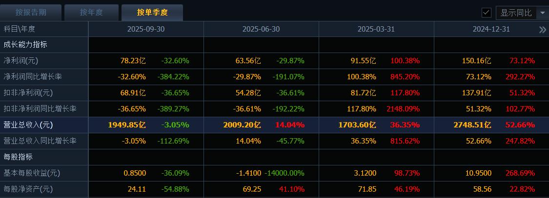 除了销量,受影响的还有公司的盈利能力,前三季度财报显示,公司第三季度营收1949.85亿元,同比下降3.05%,净利润78.23亿元,同比下降32.60%。