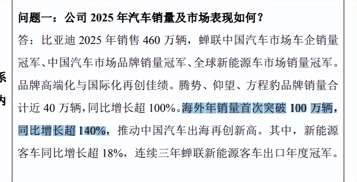 2025年全年累计销售460万辆,再次刷新年销量纪录,连续蝉联中国汽车市场车企销量冠军、中国汽车市场品牌销量冠军以及全球新能源车市场销量冠军。