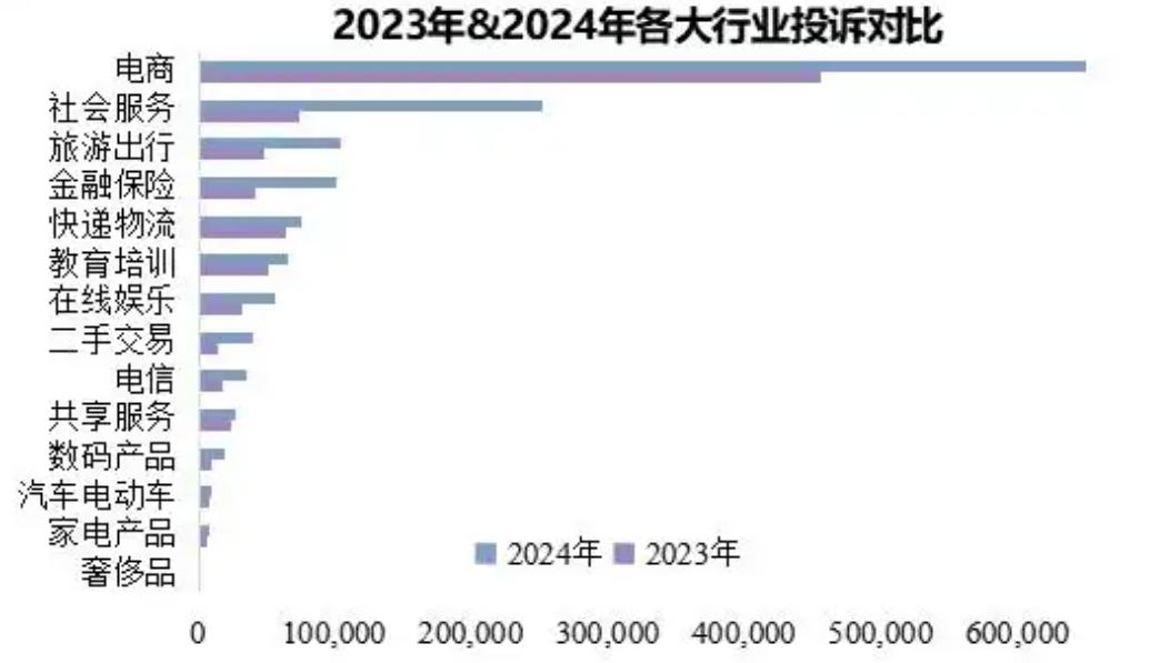 这些经营压力传导到消费端,便演变为更为复杂、多元的消费纠纷。消费保数据研究院发布的《2024年度消费投诉数据分析报告》显示,电商行业以66.24万件的投诉量位居榜首,同比增长45.32%,占投诉总量的45.50%。