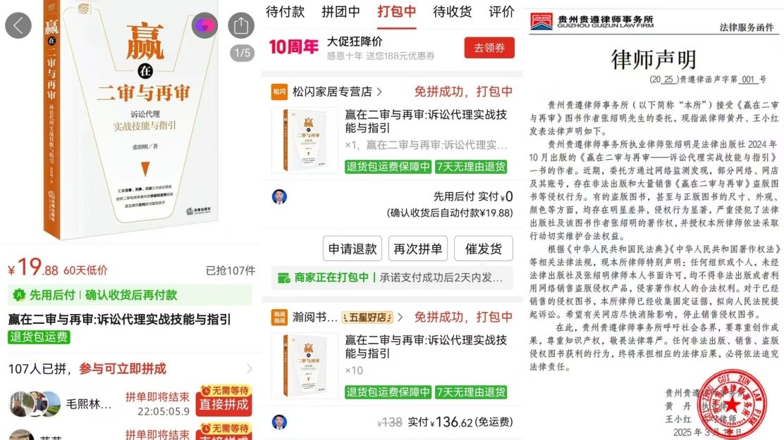 不过,拼多多的上述举措尚未完全扭转平台生态,其内部仍存在大量白牌、未获授权商品。2025年9月,法律实务类图书《赢在二审与再审》作者张绍明就曾公开发文,称其作品在拼多多上遭到大规模盗版销售。