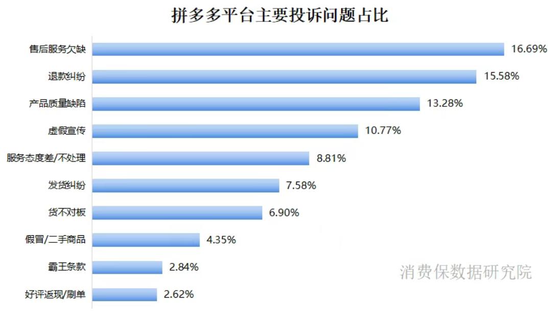 进一步探究主要投诉问题可知,售后服务缺失是拼多多的首要矛盾,占比达16.69%;与退款纠纷相关的争议以15.58%的比例位列第二;产品质量缺陷、虚假宣传、服务态度等问题,也是用户投诉中的高频词。