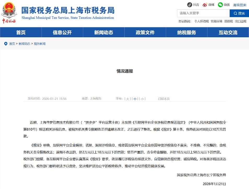 近日,拼多多(NASDAQ:PDD)运营主体上海寻梦信息技术有限公司未按照规定报送第三季度平台内经营者和从业人员涉税信息,国家税务总局上海市长宁区税务局依法对其处以10万元罚款。
