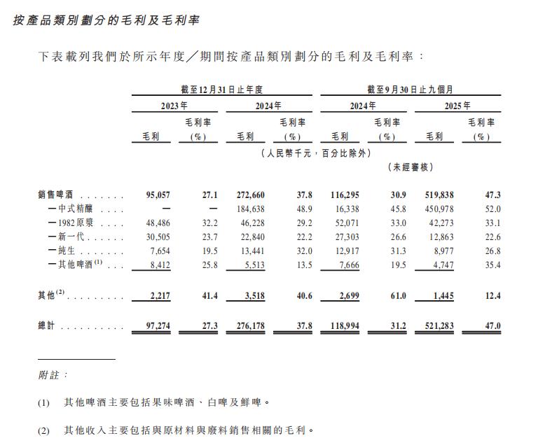 这已非普通意义上的上新品,更像是企业经营重心的整体挪动,快速攀升的数字背后,是其中式精酿从点缀到核心抓手的显著变化。收入比重陡峭带来的首先是对金星啤酒的毛利空间重新改写。按产品类别看,2025年前三季度,其中式精酿毛利率为52.0%,同期“1982”为33.1%,“新一代”为22.6%,“纯生”为26.8%,“其他啤酒”为35.4%。