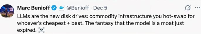 正如Salesforce.的CEO贝尼奥夫所说 大语言模型就是大型的磁盘驱动器,你可以选择最便宜的随时插拔的基础设施,模型是护城河的幻想已经结束了。
