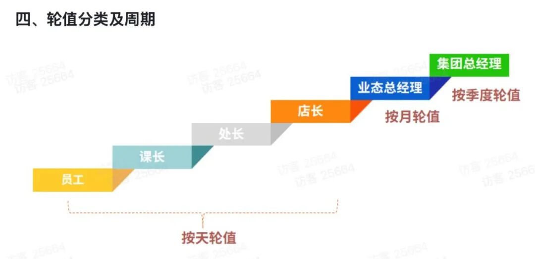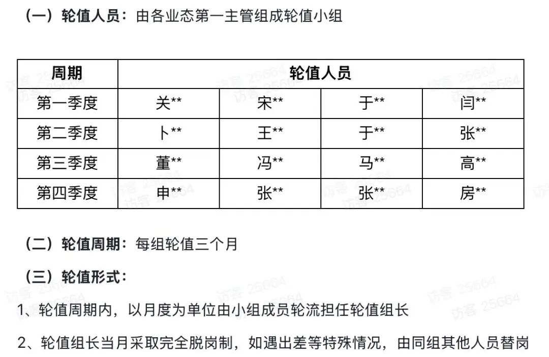 如果你打开胖东来的官网,你会看到一份《胖东来集团公司总经理轮值标准》的文件,这套标准中规划的轮值分类及周期中,明确将员工、课长、处长、店长、业态总经理、集团总经理都纳入其中。其中,员工、课长、处长、店长按天轮值,业态总经理按月轮值,集团总经理按季轮值。