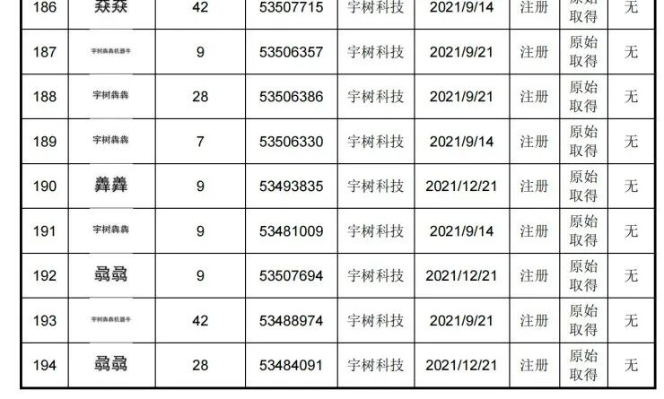 (2)动物园次幂叠词和谐音梗:宇树科技还申请了大量如“犇犇”“猋猋”“骉骉”等商标。我们的叠词一半就是“AA”“BB”,也不愧是高科技行业的,直接上次幂方程叠词。真是难为你们了,找了这么多动物。
