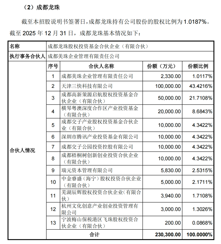 2025年6月,腾讯、阿里、蚂蚁、中国移动以4625.66元/股突击入股。美团更早在2024年1月以约13亿估值进场,到127亿估值时浮盈约9倍。红杉中国作为最早期投资者,回报数十倍。阿里系通过两个主体(杭州灏月+上海云玚)合计投入约9000万元;经纬叁号的LP中还有阿里出资6亿元。