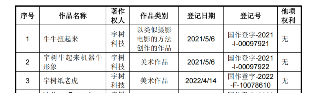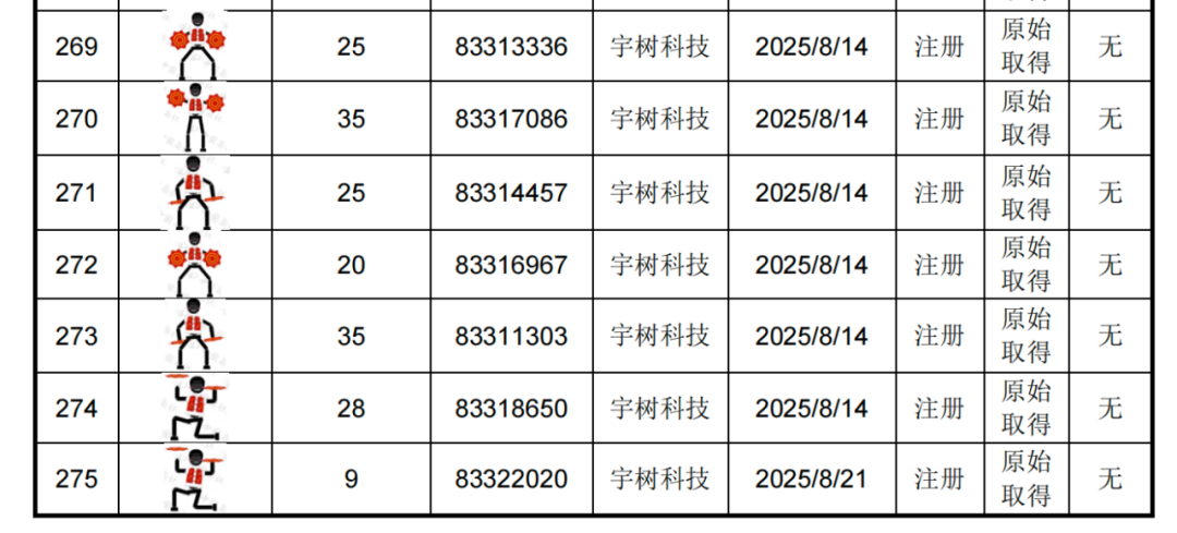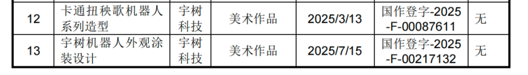 在美术作品和外观设计专利部分,宇树科技披露了一个名为“卡通扭秧歌机器人系列造型”的作品。位置:P1-1-332至P1-1-134等(境内商标部分)。