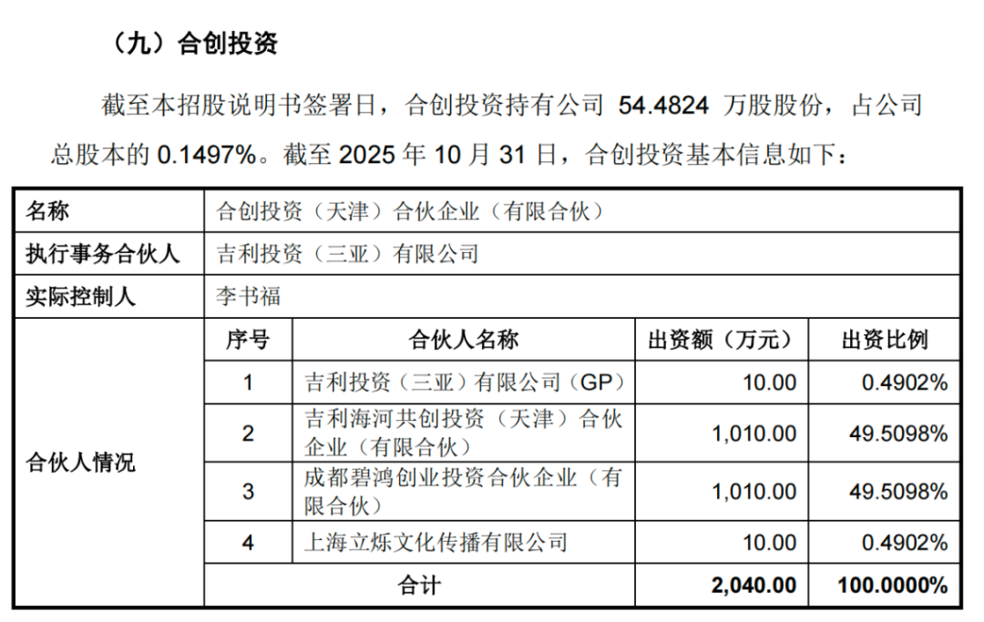(4)吉利:通过合创投资,吉利控股的李书福也是该公司的间接投资人之一。