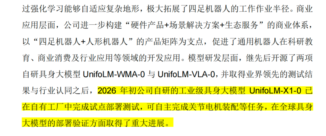 招股书提到,2026年初公司自研的工业级具身大模型UnifoLM-X1-0已在自有工厂中完成部署测试,任务是:“自主完成关节电机装配”。