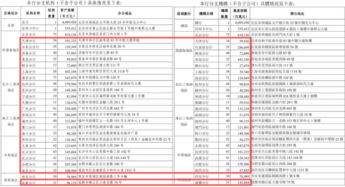 仔细观察后不难发现,两则报告的分支机构资产规模均为6.99万亿元,但A股报告中厦门分行的518.78亿元资产规模,在H股报告中对应到了深圳分行名下,类似的情况还发生在重庆和南京分行、上海和青岛分行等多家分支机构身上。