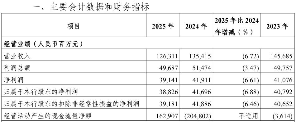 2025年,光大银行的归母净利润为388.26亿元,同比下滑6.88%;扣非后净利润为391.81亿元,同比下滑6.46%。在行业整体业绩分化的大背景下,该行是少数营收与利润“双双跳水”的A股上市银行,处境颇为尴尬。