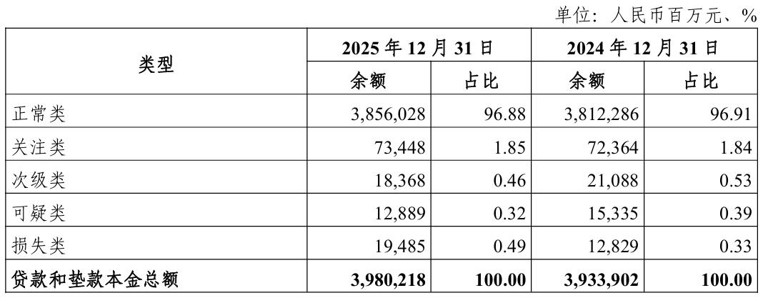 进一步细分可知,光大银行的关注类贷款的占比虽提升了0.01个百分点至1.85%,但不良贷款类目中实际核销损失风险最高的损失类贷款增幅更为显著,由2024年的128.29亿元增至2025年的194.85亿元,占比也由0.33%增至0.49%。