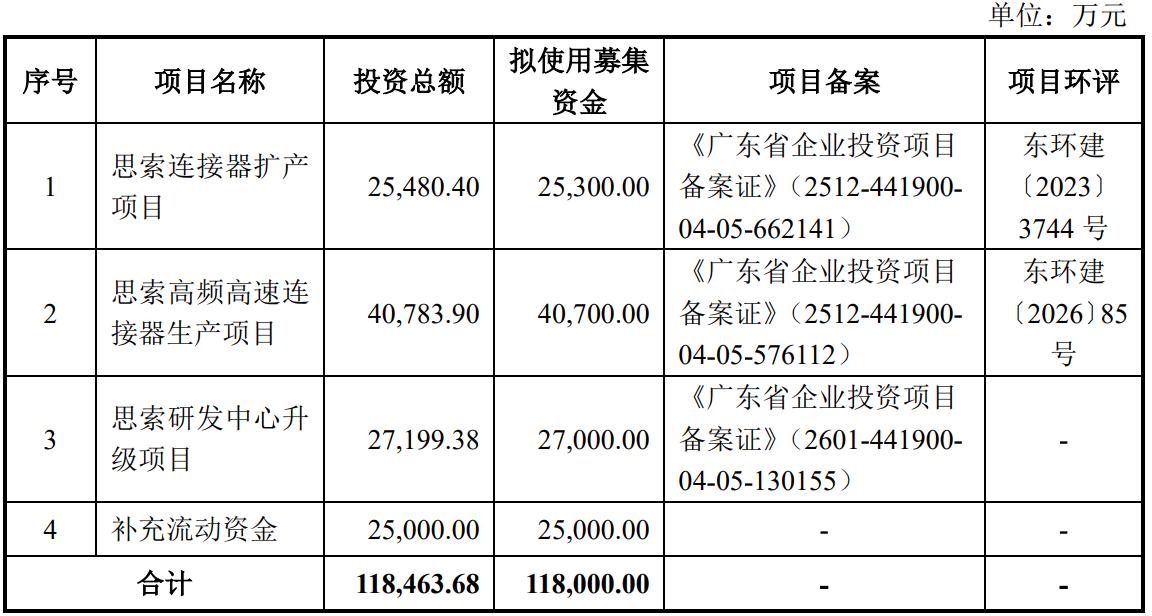 最新招股书显示,思索技术计划募资11.8亿元。其中,2.53亿元将用于思索连接器扩产项目,4.07亿元用于思索高频高速连接器生产项目,2.70亿元用于思索研发中心升级项目,另外2.50亿元补充流动资金。